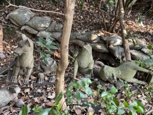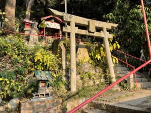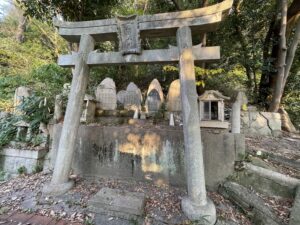 社務所裏の登山口から少し上がると多くの祠や石碑が密集しています。