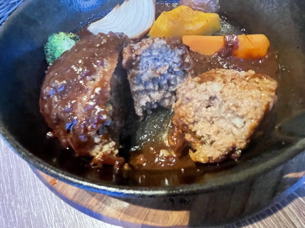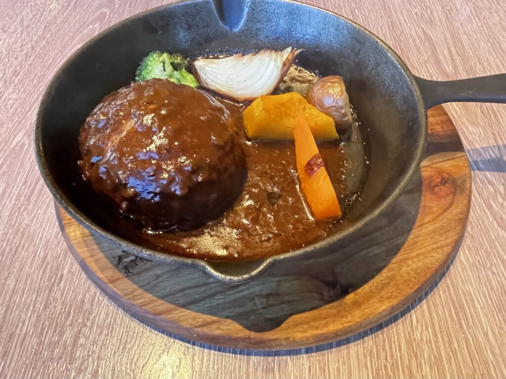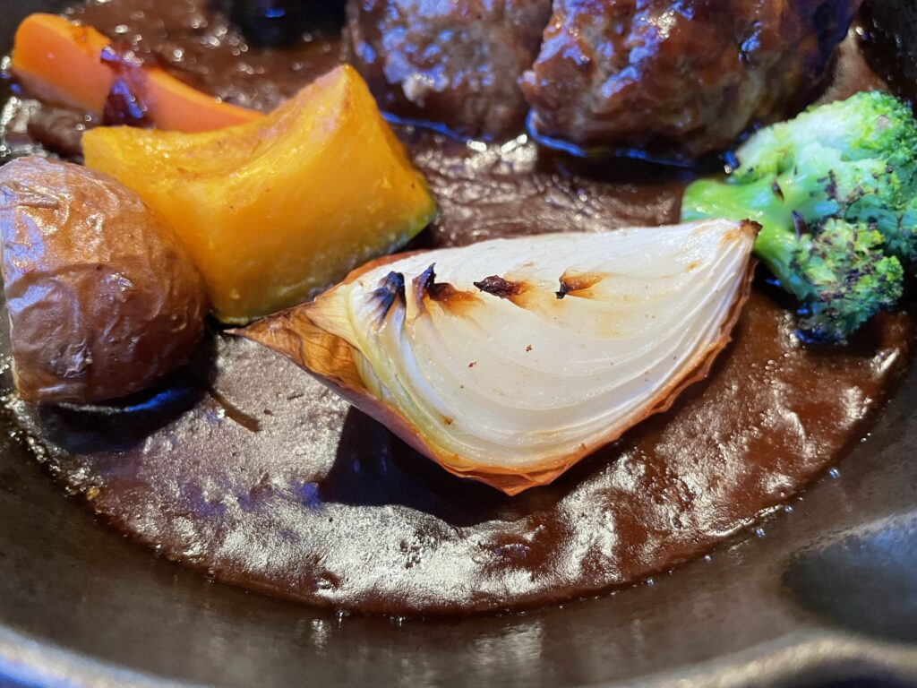 肉汁たっぷりのハンバーグに可愛い野菜たちが添え付けられてきます。