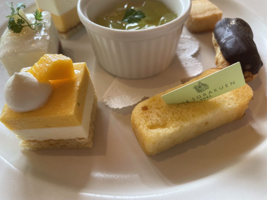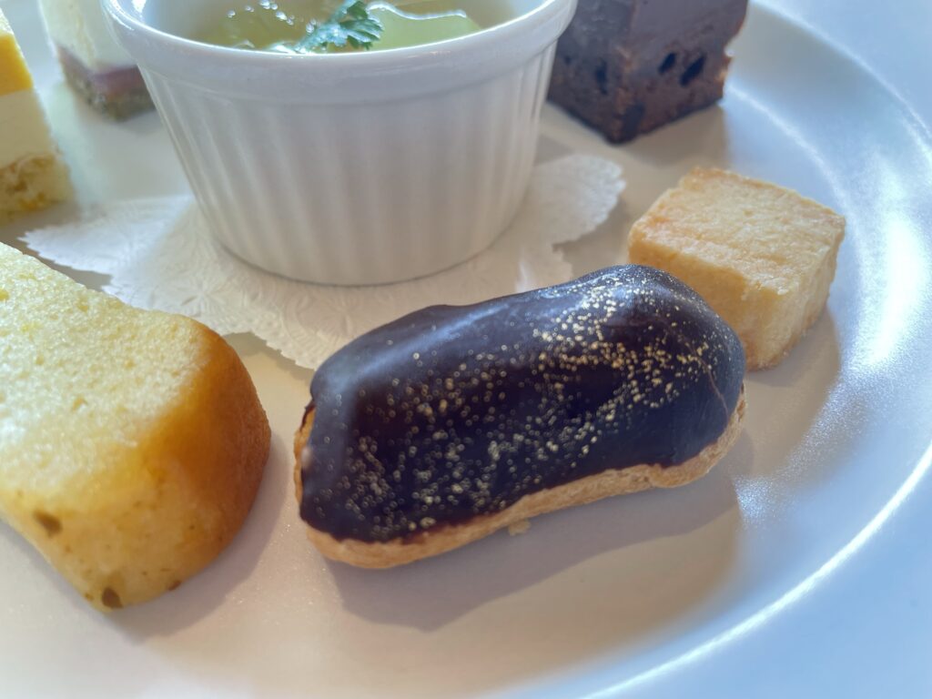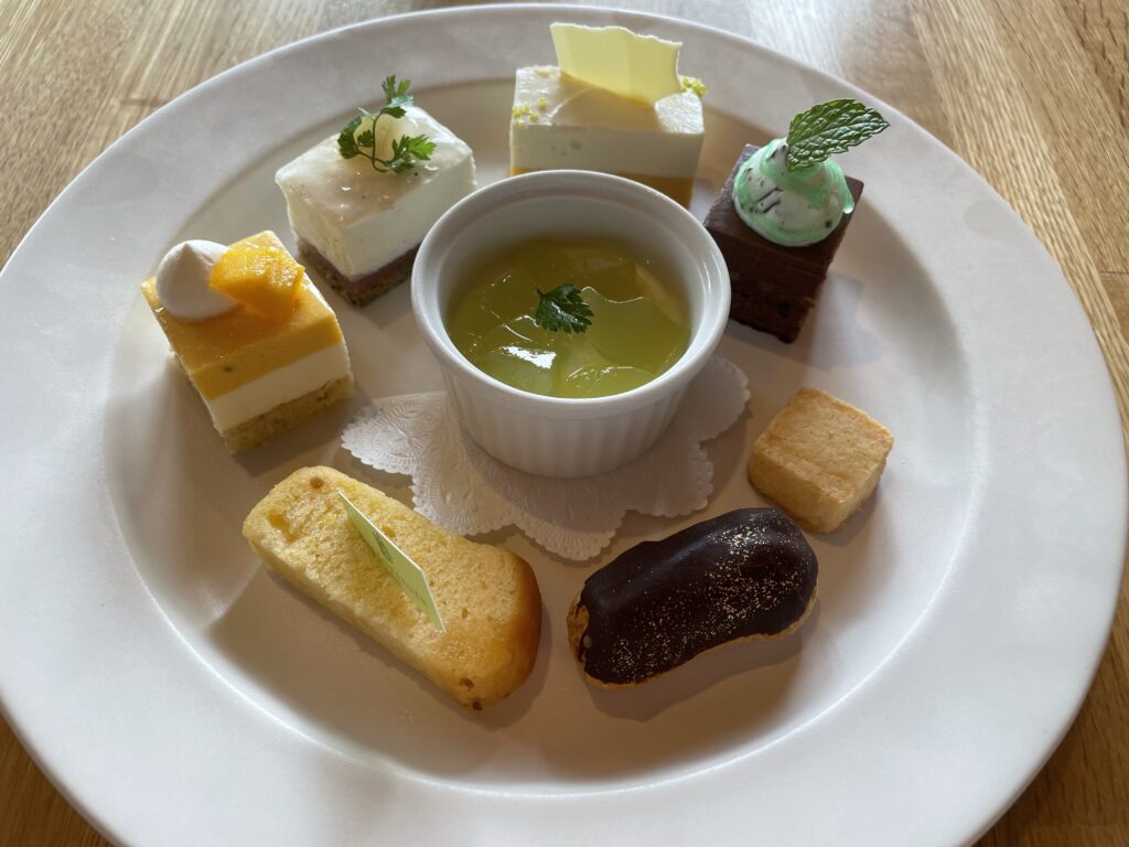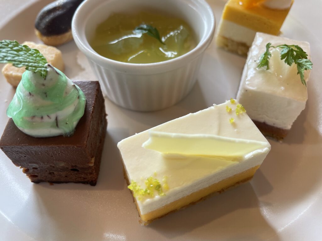 メロンのブランマンジェ、マンゴーと杏仁のムース、ホワイトチョコとパッションのムース、白桃とアールグレイのムース、チョコミント、エクレア、レモンと蜂蜜のパウンド、ココナッツサブレ