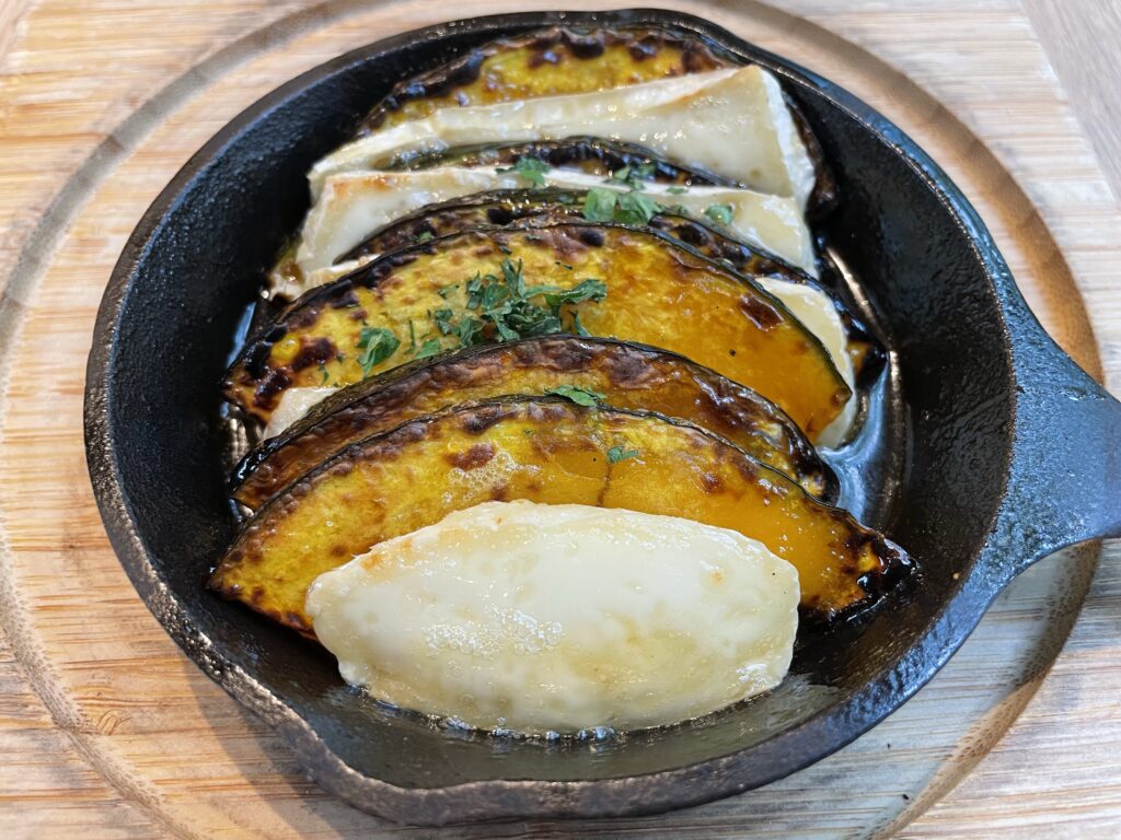 カマンベールとかぼちゃがアツアツ鉄板にのせられてパチパチ音をたてながらやってきます。