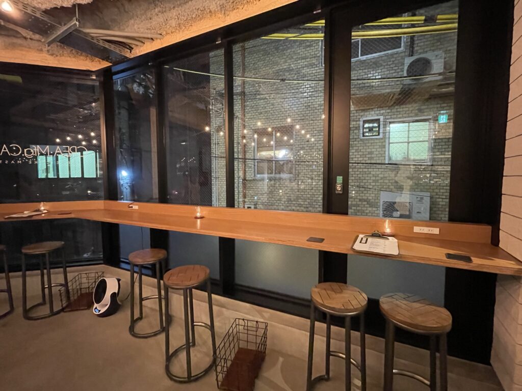 カフェスペースは全面ガラス張りなので開放感があるのはもちろんのこと、カウンター席から路地裏の雰囲気を眺めるのは楽しいのもです。