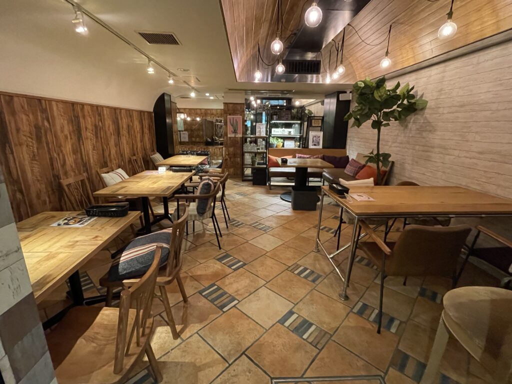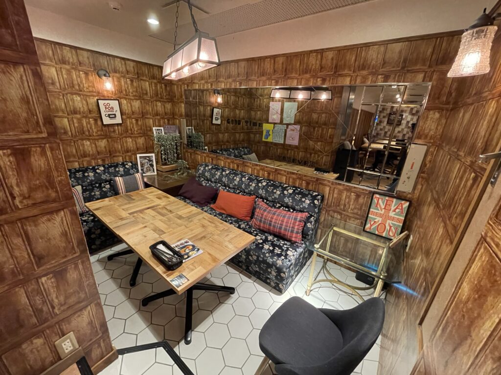 地下カフェは居心地の良い空間で4人掛けのテーブルが5つ用意されており、奥にはプライベート感のあるBOX席があります。