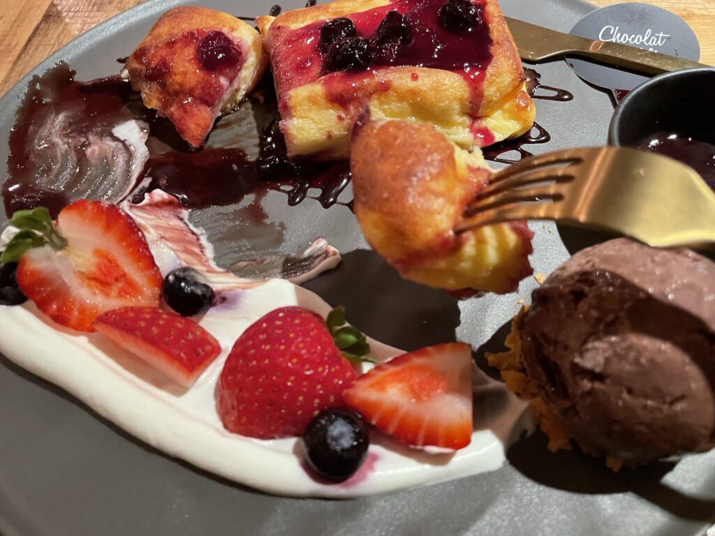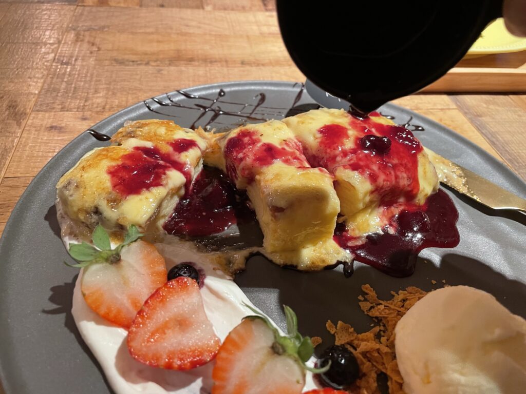 酸味の効いたベリーソースをかけて異なった味を楽しみます。