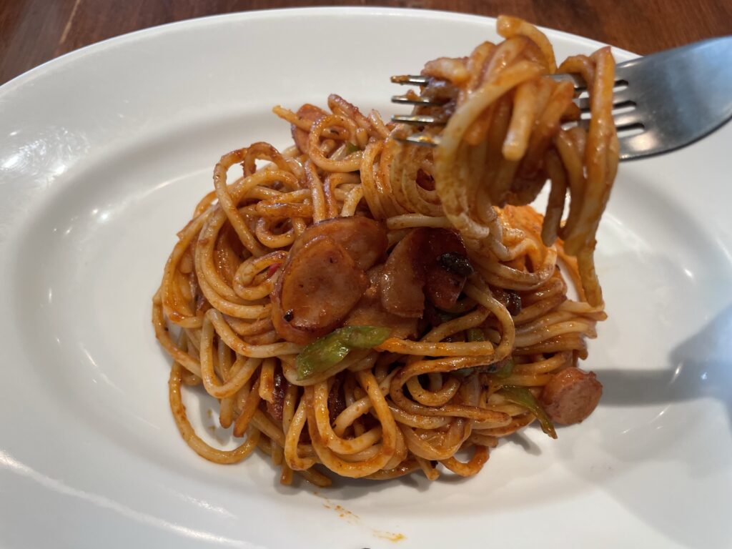ナポリタンソースがよく絡んでいて、極太メンのナポリタンはモッチモチの食感で食べ応えがあります