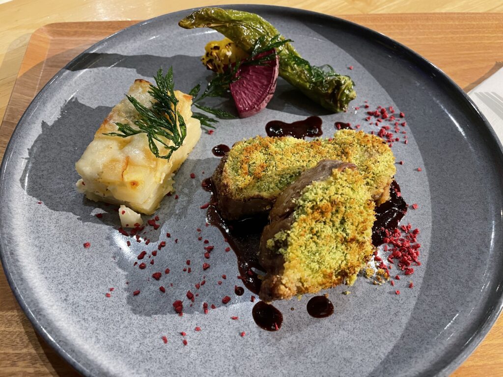 パン粉をまぶしサクサク食感で食べ応えのある肉厚豚肩ロース、赤ワインソースをつけて贅沢に頬張ります。
