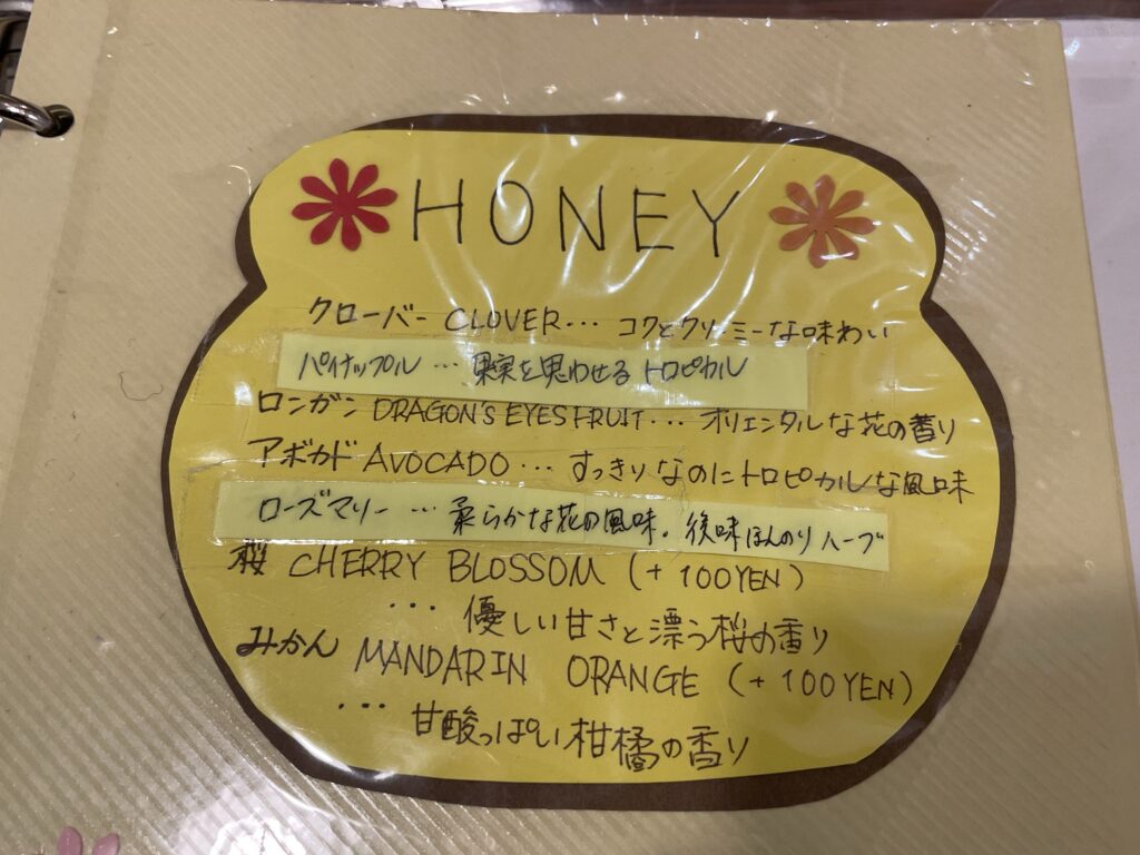 数種類のハチミツの中から1つ選んでパンケーキにかけて食べる乙女に人気のお店です。