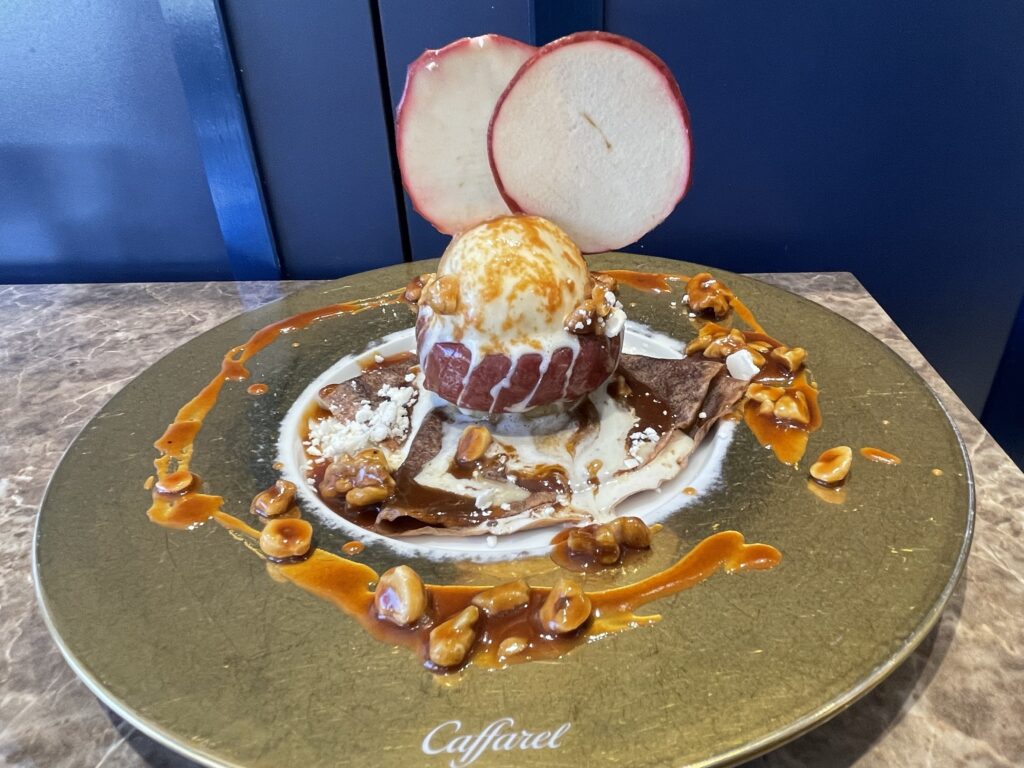 米粉のクレープの上にさつまいものガレット、焼きリンゴをのせ、仕上げにバニラジェラートとさつまいものチップが添えられています。