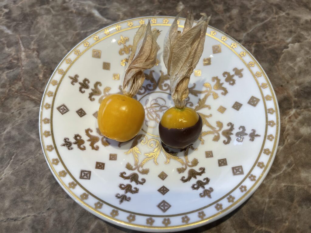 チョコのついたホオズキとフレッシュなホオズキ2種を一皿にセット。