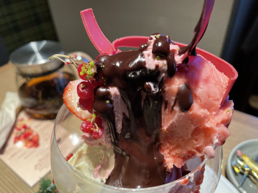 メインはグラスの中のピスタチオアイスとベリーアイスかな、それぞれを半分ほど食べて下層にあるベリーのコンフィチュールとクランチをグルグルかき混ぜてみたよ。
