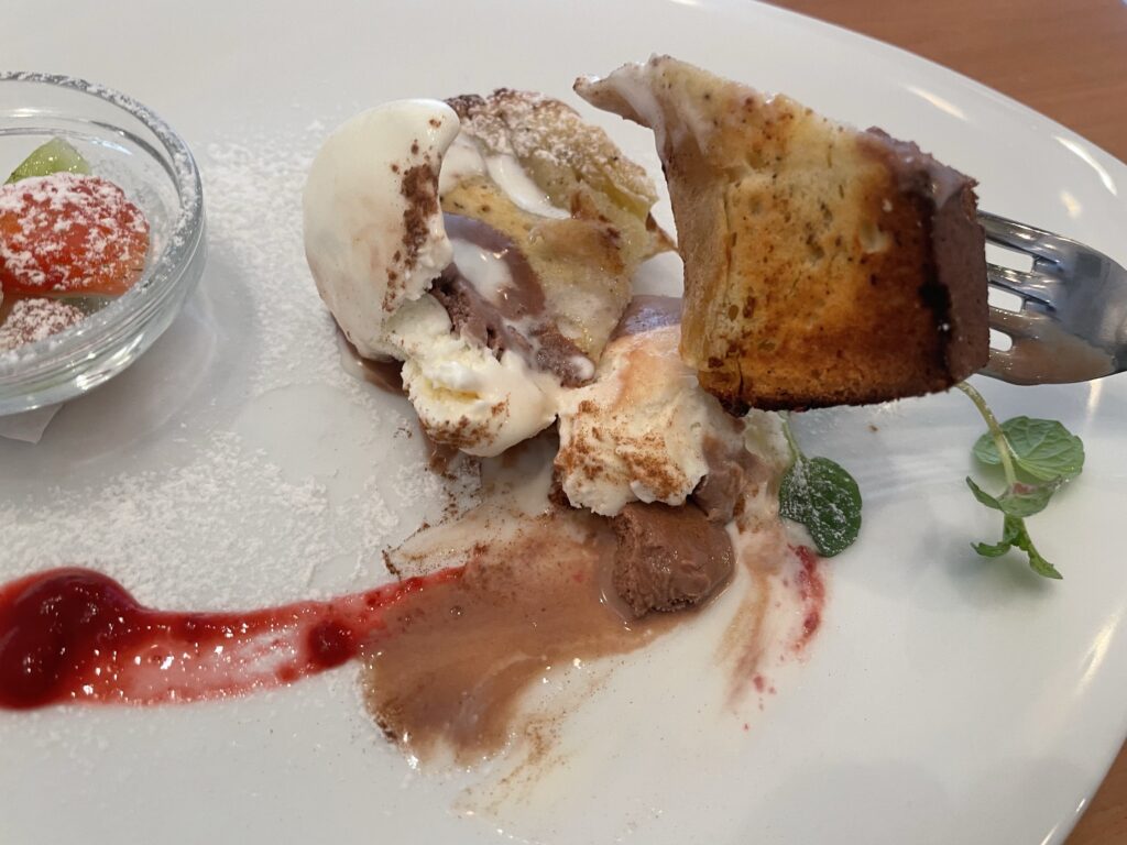 温められたリンゴのシフォンケーキとバニラ・チョコアイスだったかなw