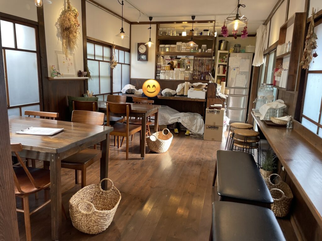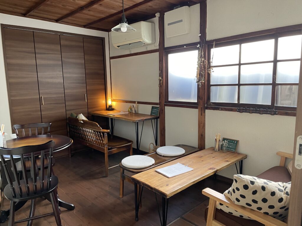 左側の部屋は4人掛けのテーブルとカウンターが設置されていて、奥にはレジとキッチン、お子さんの遊び場となっています。