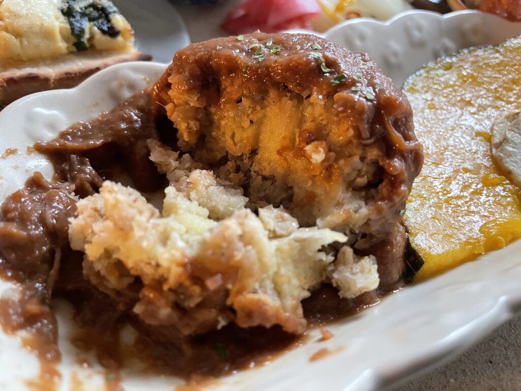 中身はサツマイモ、オートミールのハンバーグで包んでいます。