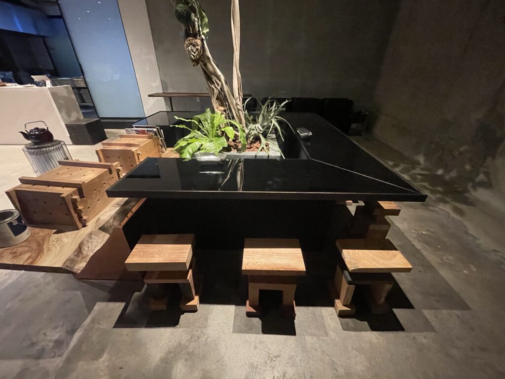 その大きな木を取り囲むようにエレガントな艶有りブラックのテーブルが設置されているのも魅了されます。