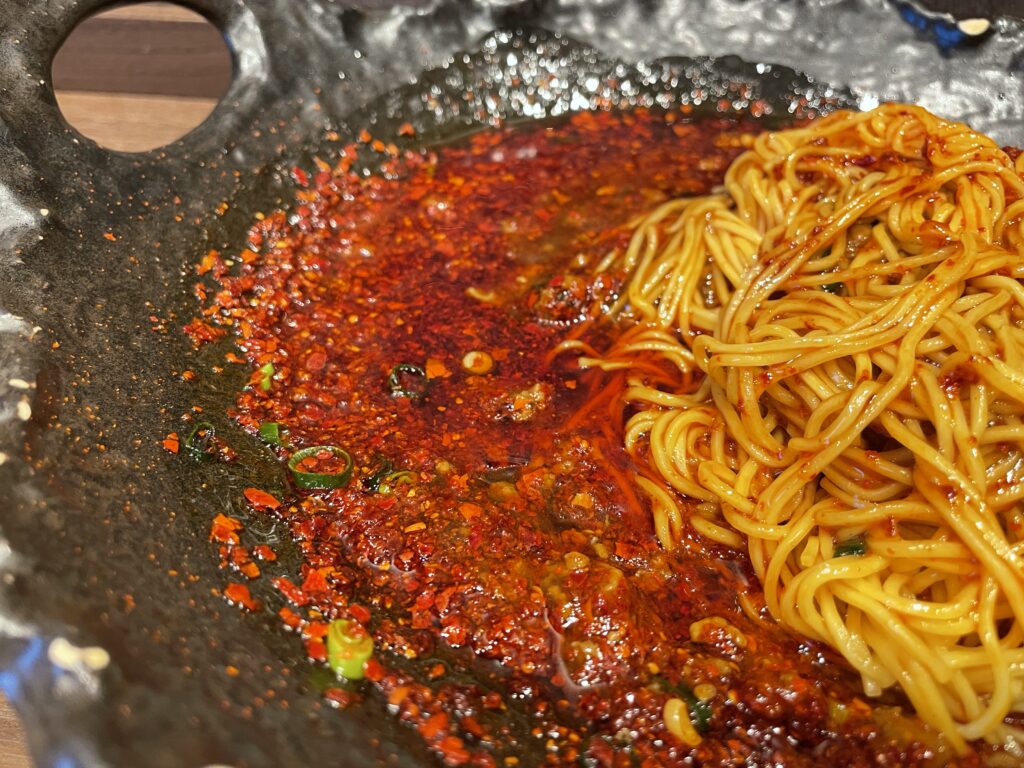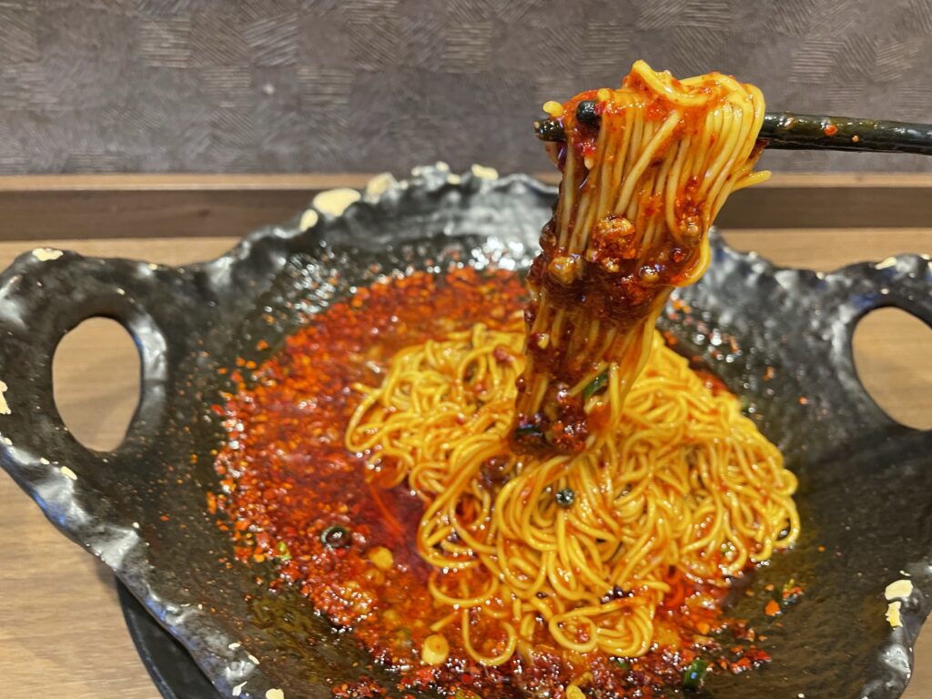唐辛子をふんだんに使用したこの麺料理は、辛いもの好きにはぜひ食べていただきたい人気の逸品です。