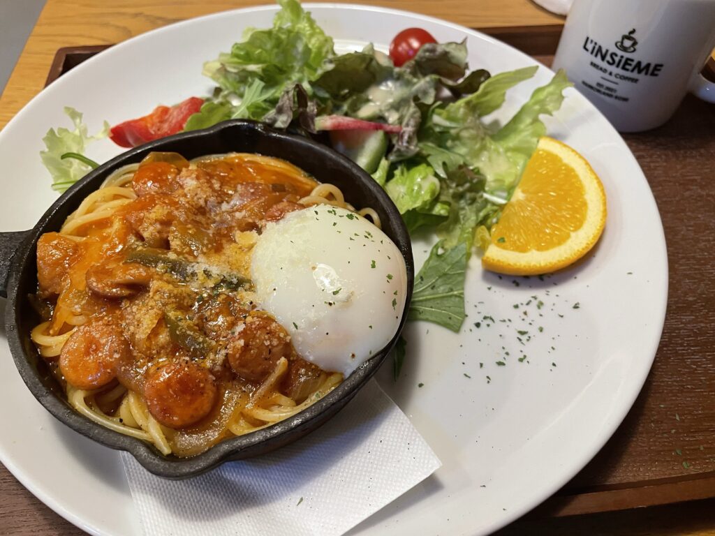 「鉄板ナポリタン 半熟卵のせ」は、香ばしく焼き上げられたスパゲッティにトマトソースが絡んでおり、その上に濃厚な半熟卵がのっています。