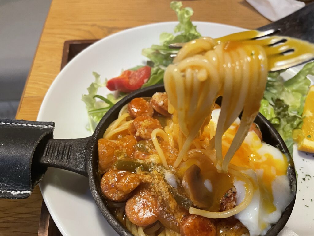 鉄板で焼かれたスパゲッティは香ばしさが際立ち、食感も抜群です。