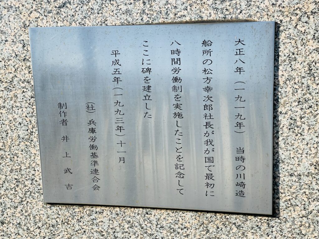 この記念碑は、カワサキ造船の社長が初めて8時間労働制を導入したことを讃えて建てられました。