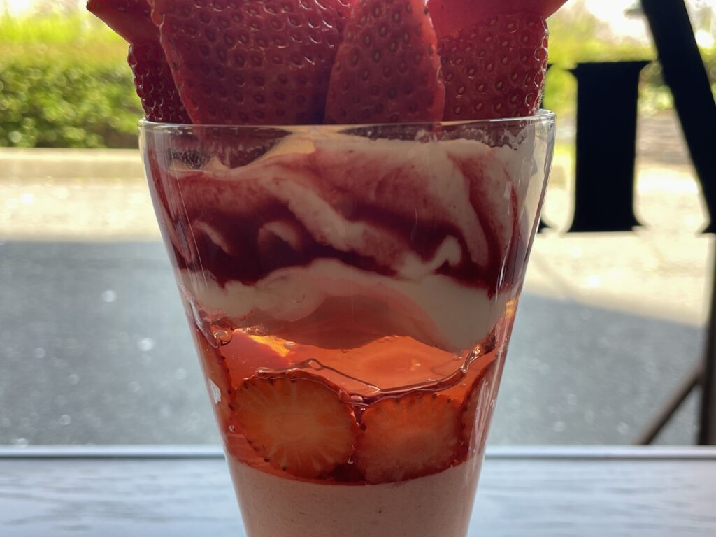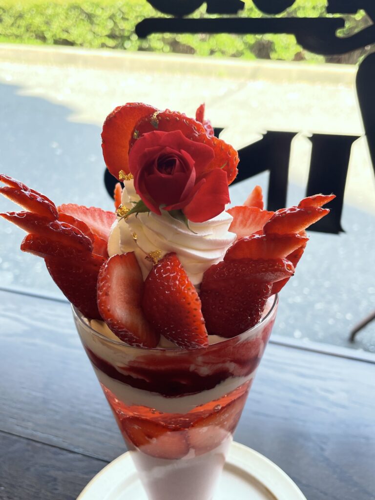 また、金粉がちりばめられた贅沢な装飾が、特別感を演出し、ひと口ごとに至福のひと時を味わえます。このイチゴパルフェは、美味しさと華やかさを兼ね備えた、まさに絶品の一品です。