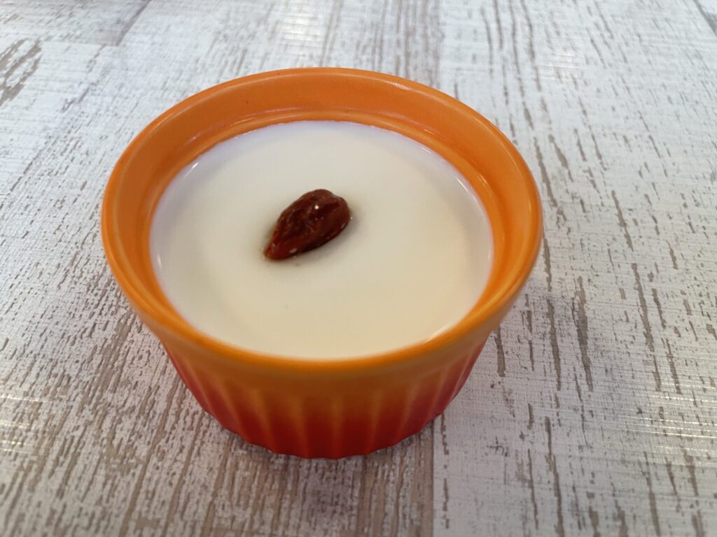 ミニデザートの手作り杏仁豆腐とカフェオレ、グァバジュース。