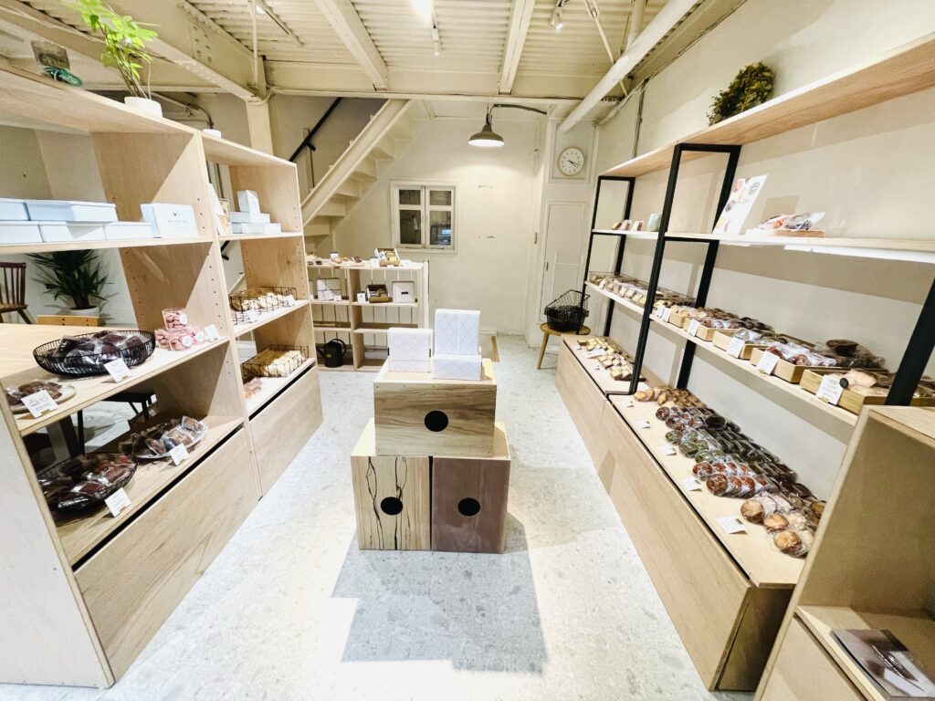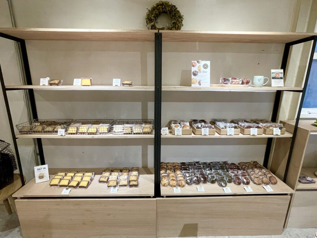 それぞれの焼き菓子が丁寧に陳列されているこの販売コーナーは、店舗の魅力を際立たせる存在となっています。ただ商品を置いているだけでなく、視覚的な工夫が施されており、見る者の視線を引きつけます。