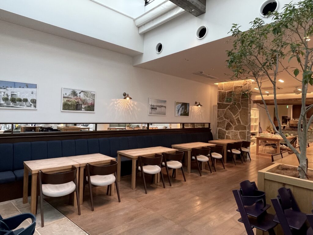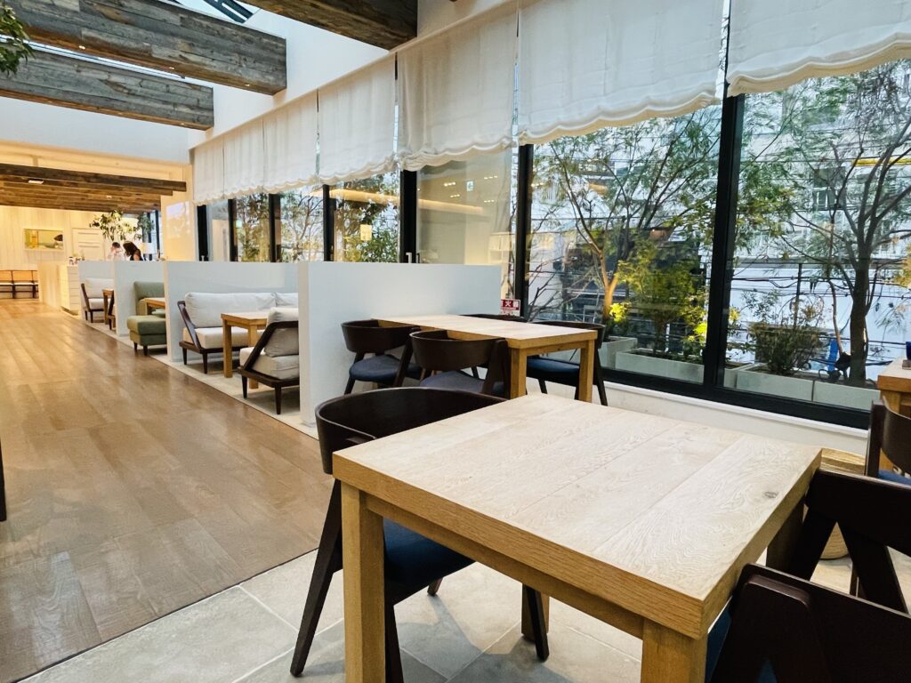 ロンハーマンカフェの内観は、スタイリッシュでありつつもシックなデザインが施され、ゆったりとした空間に天井から差し込む自然光が特徴的です。