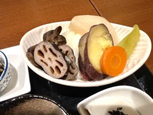 まず、目に飛び込んでくるのは、色とりどりの温野菜たち。鮮やかな彩りが食欲をそそります。それぞれが自然の恵みを受けて育った証、鮮やかな色を放っています。