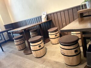 温かみのある木製のバーカウンターや照明、そして、バレル(樽)を模したスツールはユニークでおしゃれですね。