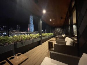 ハーバーランドを見渡せるテラス席は、モザイクのネオンが水面に映り、美しい光のコントラストがさらに魅力的な空間を創り上げています。