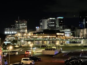 夜景が輝く港を背景に、コーヒーを味わうのはまるで映画の中にいるよう。