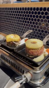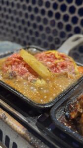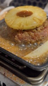 焼肉の後にいただいたのは、名物のハンバーグ。今回は「パイン」と「チーズ」の2種類をチョイスしました。