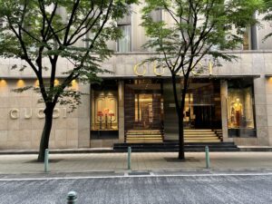 見の前の道路では高級車が走り、向かえにGUCCIのお店があります。