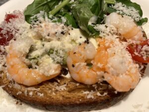 バゲットをスライスしてプリプリのエビとアボカドをのせています。